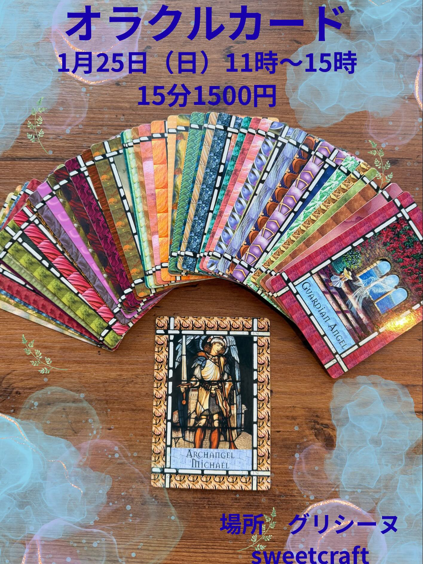 こんにちはこんにちは。sweet craftです。 1月25日(日)11時〜15時でオラクルカードを行います。 ✨オラクルカード✨ 今のお悩み、迷っている事をオラクルカードに聞いてみませんか。 引いて頂いたカードをこちらで解説致し […]